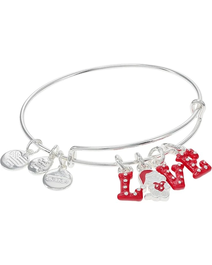 Feel the positive vibes all around by wearing Alex and Ani Peanuts Snoopy Love Multi-Charm Bracelet.SKU: #9864532Rafaelian Silver® construction.Silver-tone finish.Four Snoopy “love” script dangles.Three charm dangles.Squeeze adjustable clasp closure.Comes with box.Made in the USA.Measurements: