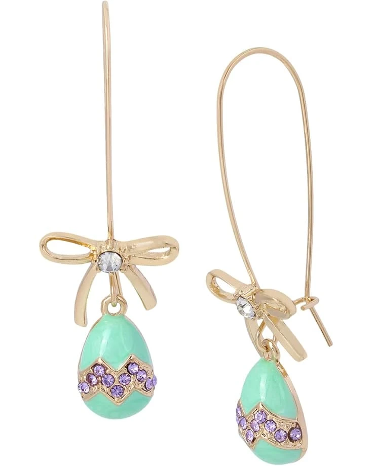 Betsey Johnson® knows how to bring a smile to anyone’s face! This New York-designed jewelry collection pops with life, color, and all of the fanciful things life has to offer.SKU: #9877361Make a subtle yet charming statement by wearing the Betsey Johnson® Egg Dangle Earrings. Made from polished metal, glass, and plastic.Dangle earrings featuring elegant long ear wire with bow and colorful egg charm drop adorned with minimal stone accents.Shepherds hook closure. Wipe with a soft dry polishing cloth.