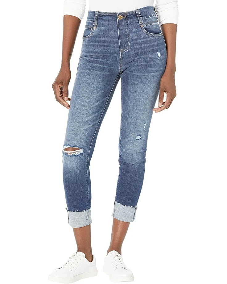 Feel free to walk, dance and run with Liverpool® Gia Glider Pull-On Crop Skinny with Cuff Cut Hem in Fanning.SKU: #9863969Stretch denim fabric offers amazing recovery for all-day comfort.Mid-rise. Buttoned front closure. Set-in waistband with loops. Faux fly with no zipper. Pull-on construction. Cuffed and raw hemline. 88.1% cotton, 9.9% polyester (T400), 2% lycra. Machine washable.Imported. Product measurements were taken using size 4. Please note that measurements may vary by size.Measurements: